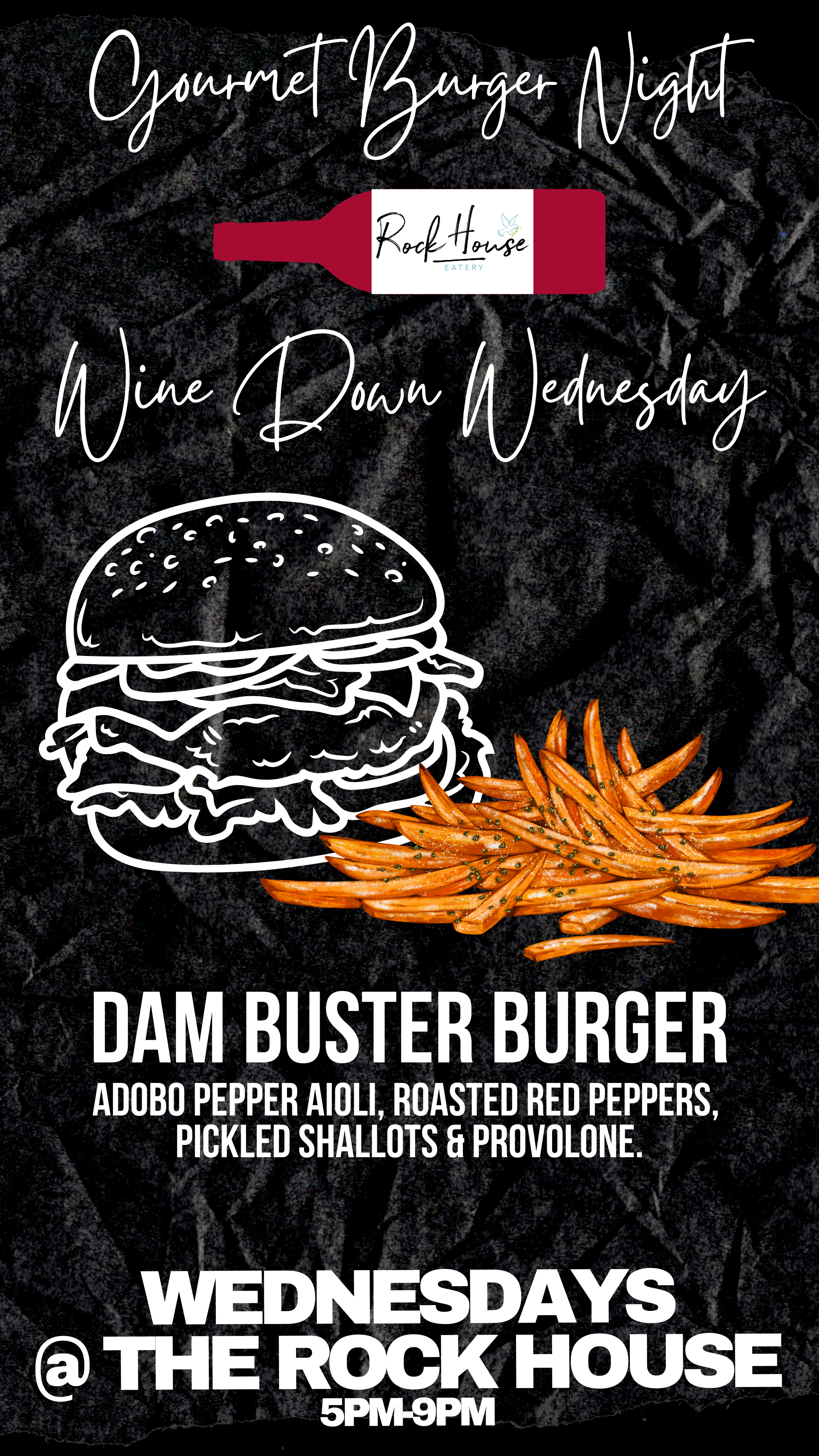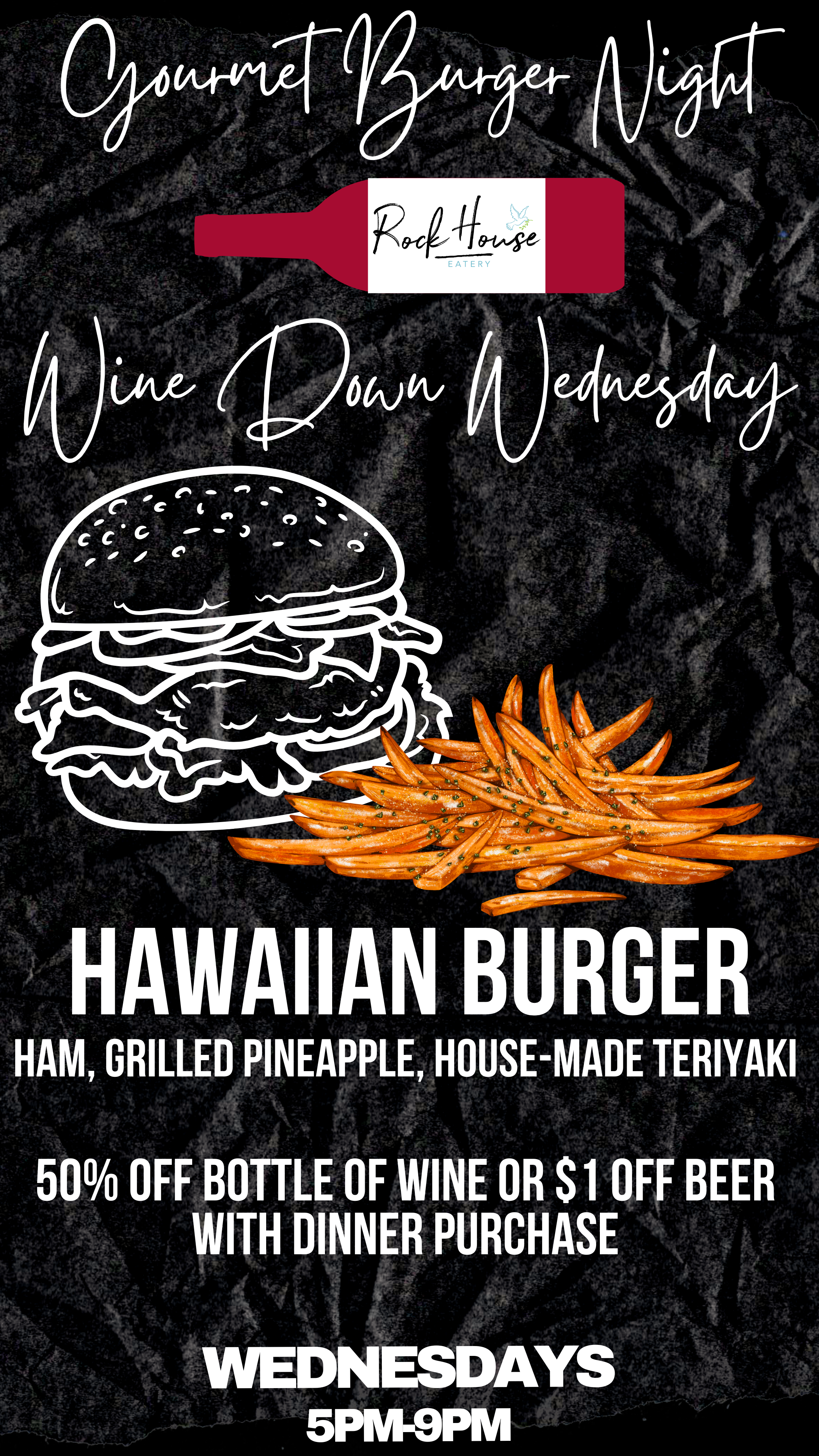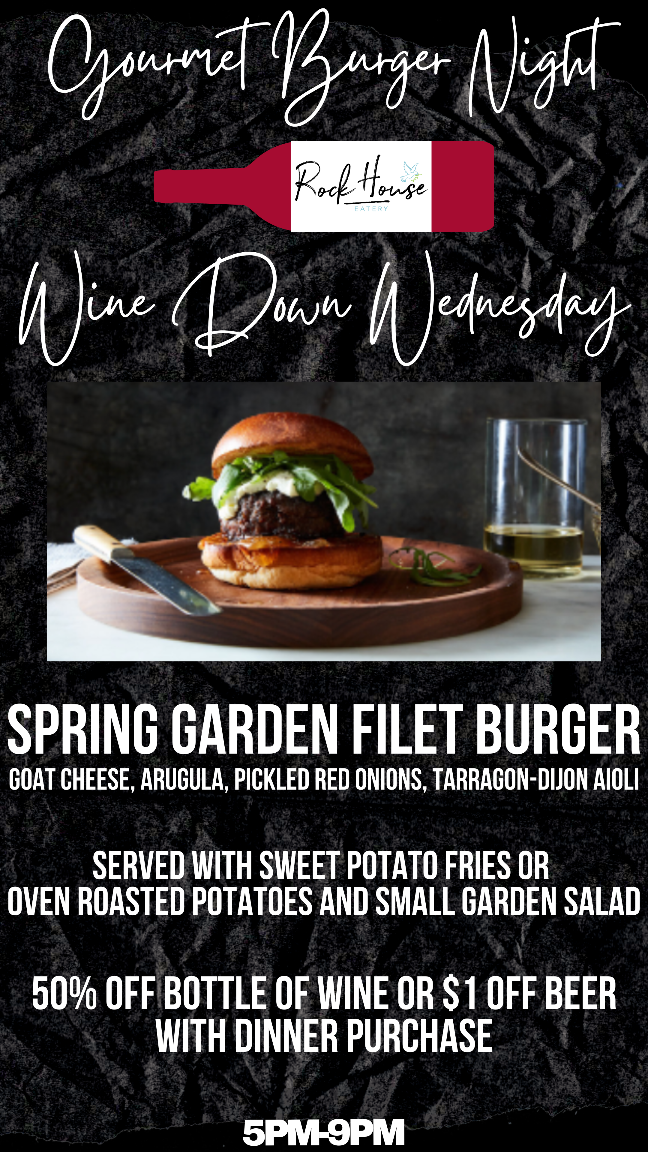 Wednesday nights Steak Dinner for 2 for only $60.95, Gourmet burger night and wine down wednesday! 5pm-9pm
