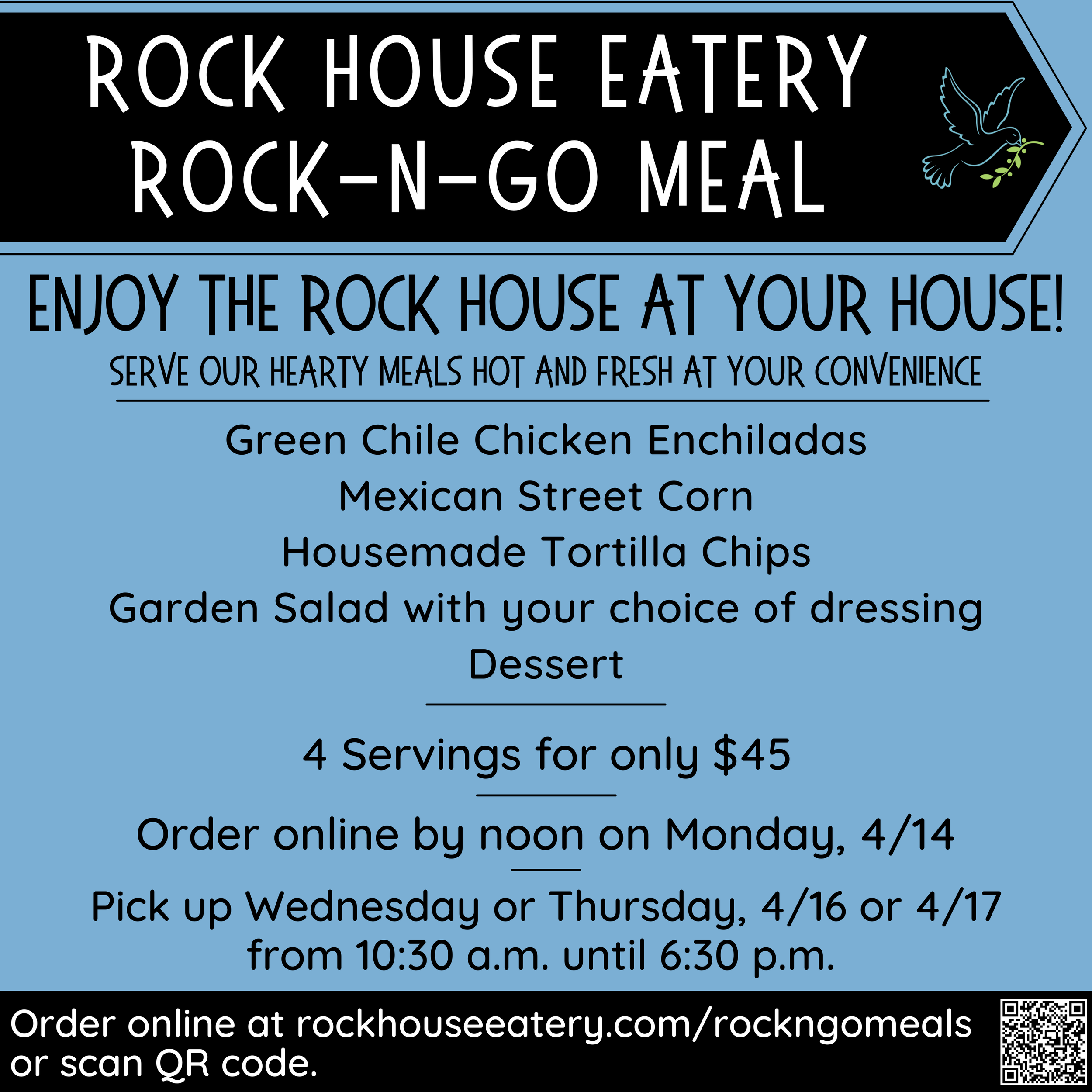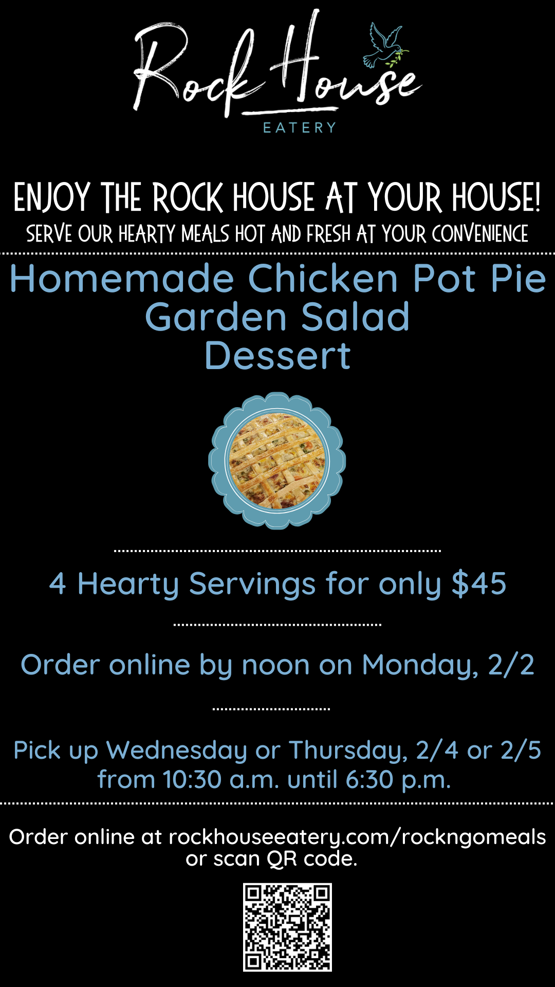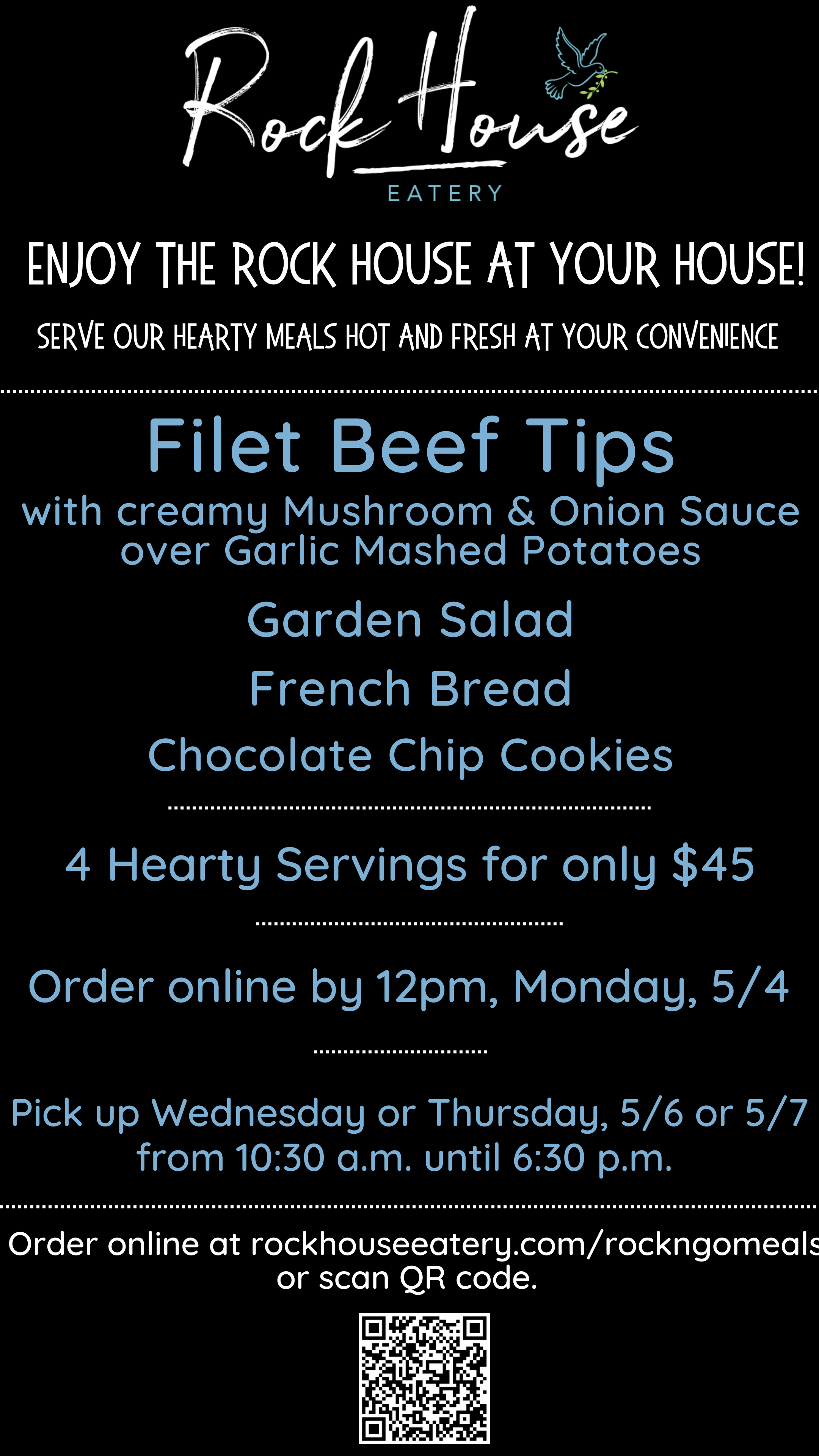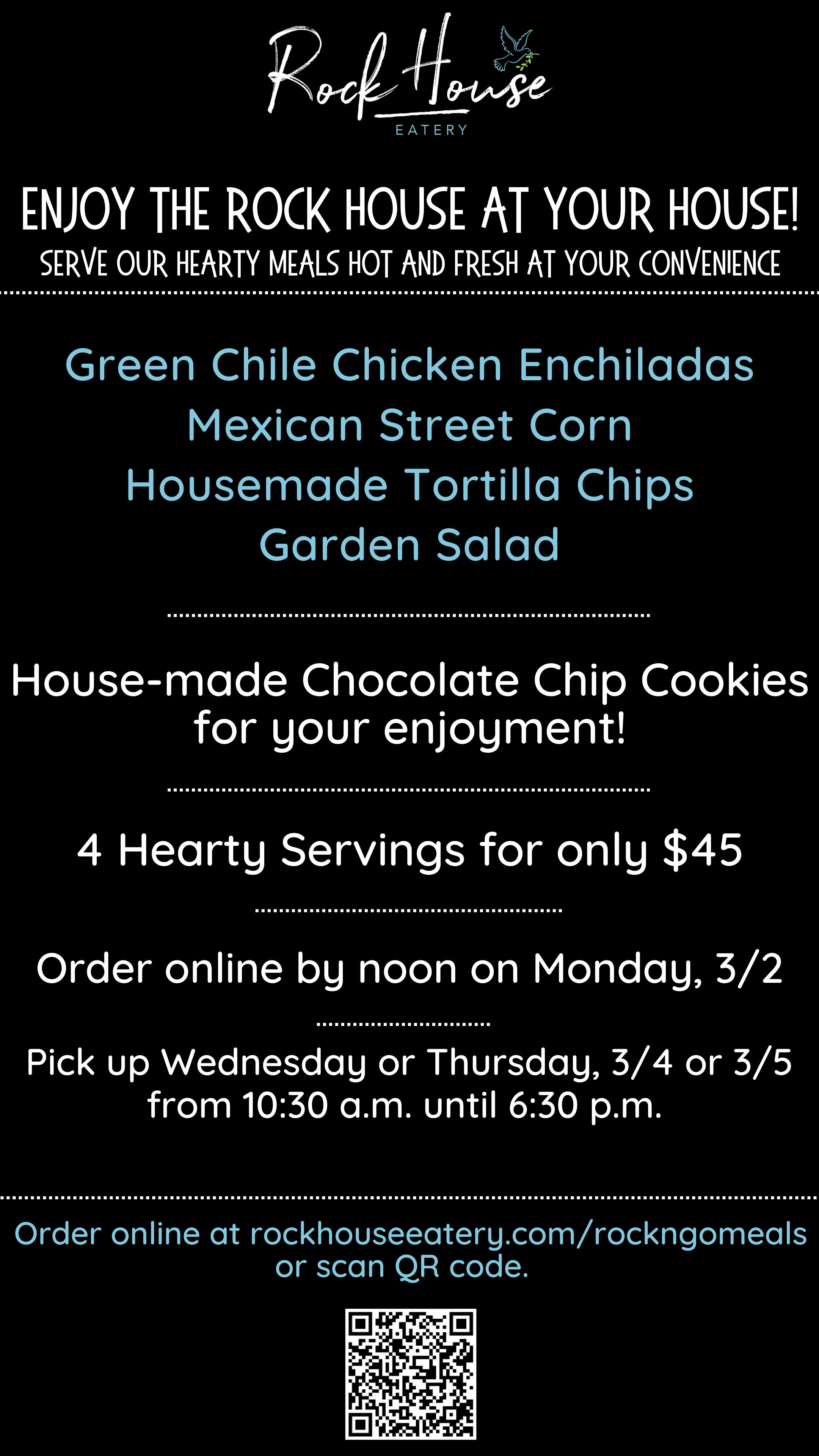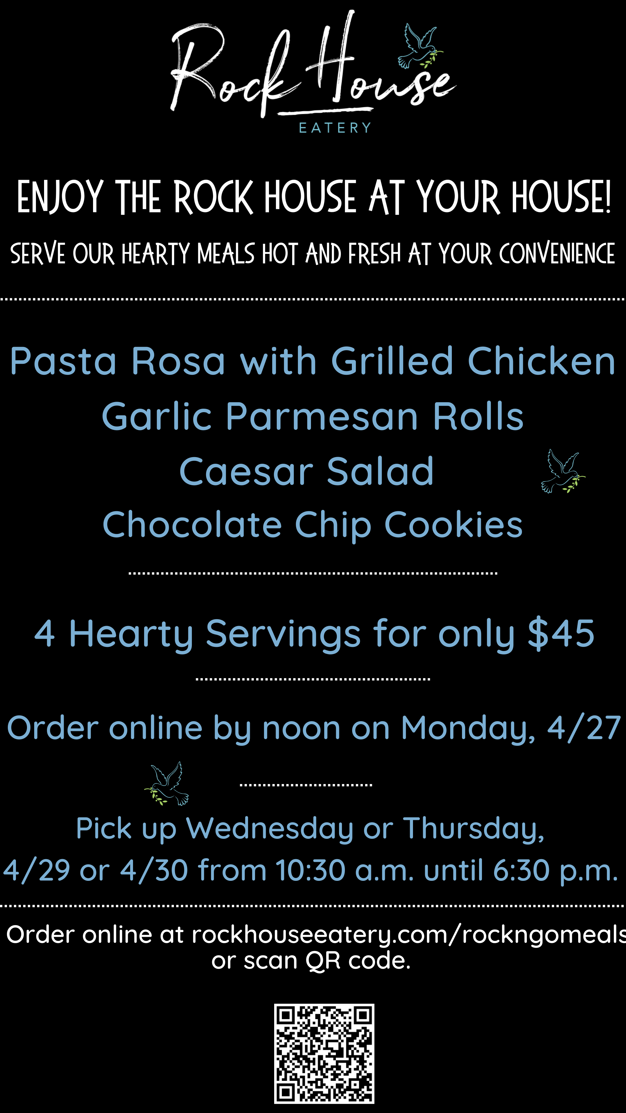 Thank you for letting us help to make your life a little easier by providing fresh, quality meals for you at your convenience. Our meals are great for your home, office, church functions, meals for friends, and more! Serve our hearty meals hot and fresh at your convenience. Our meals are posted at the beginning each week on our website and the Rock House Eatery Facebook page.