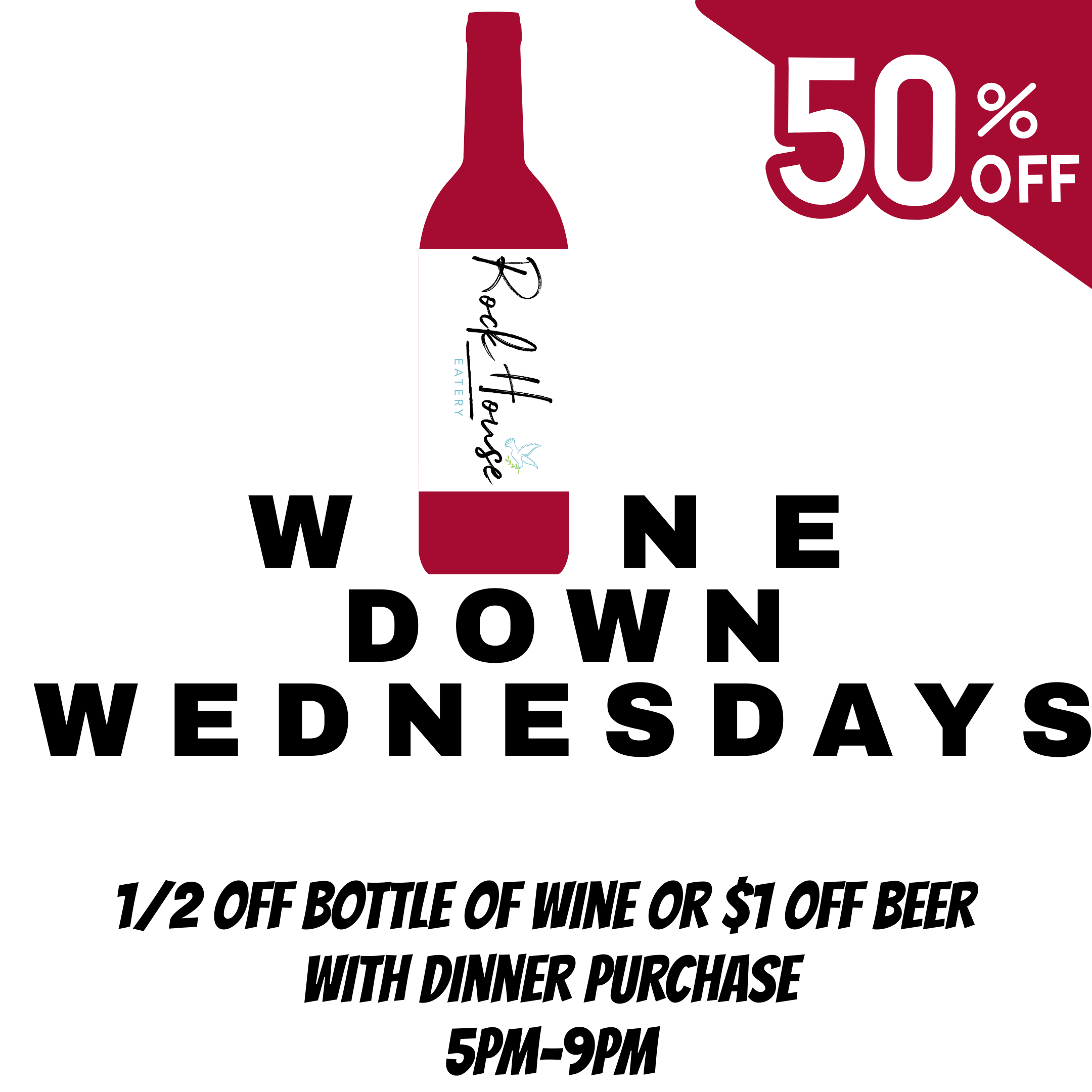 50% off bottles of wine and $1 off beer with dinner purchase!