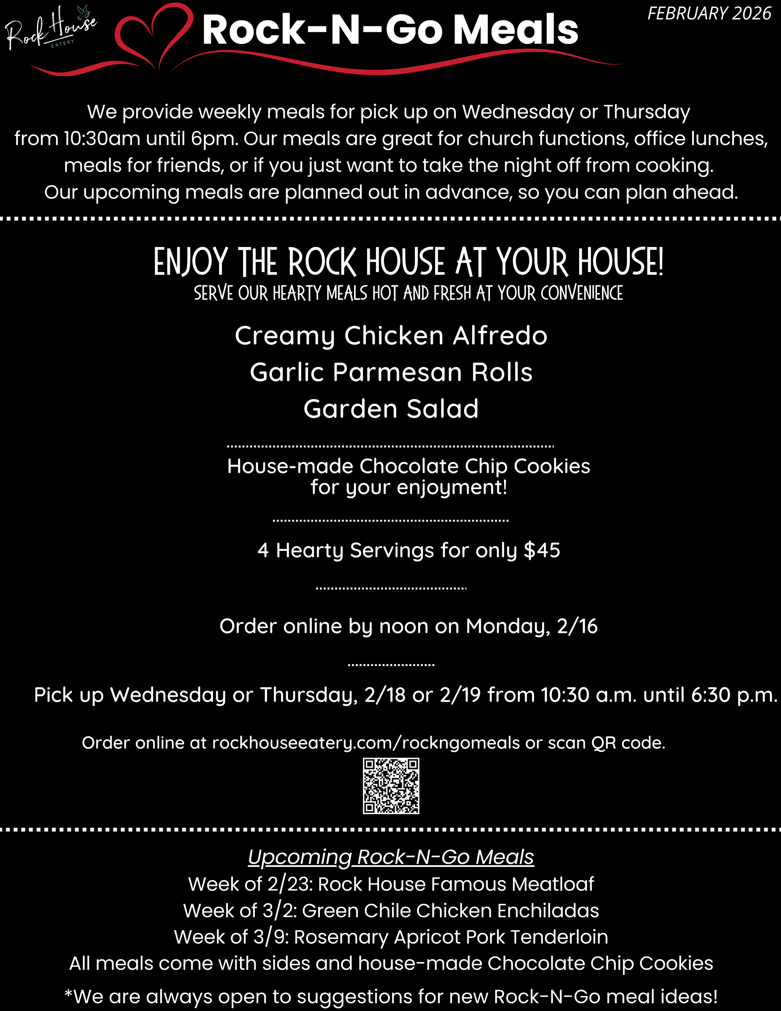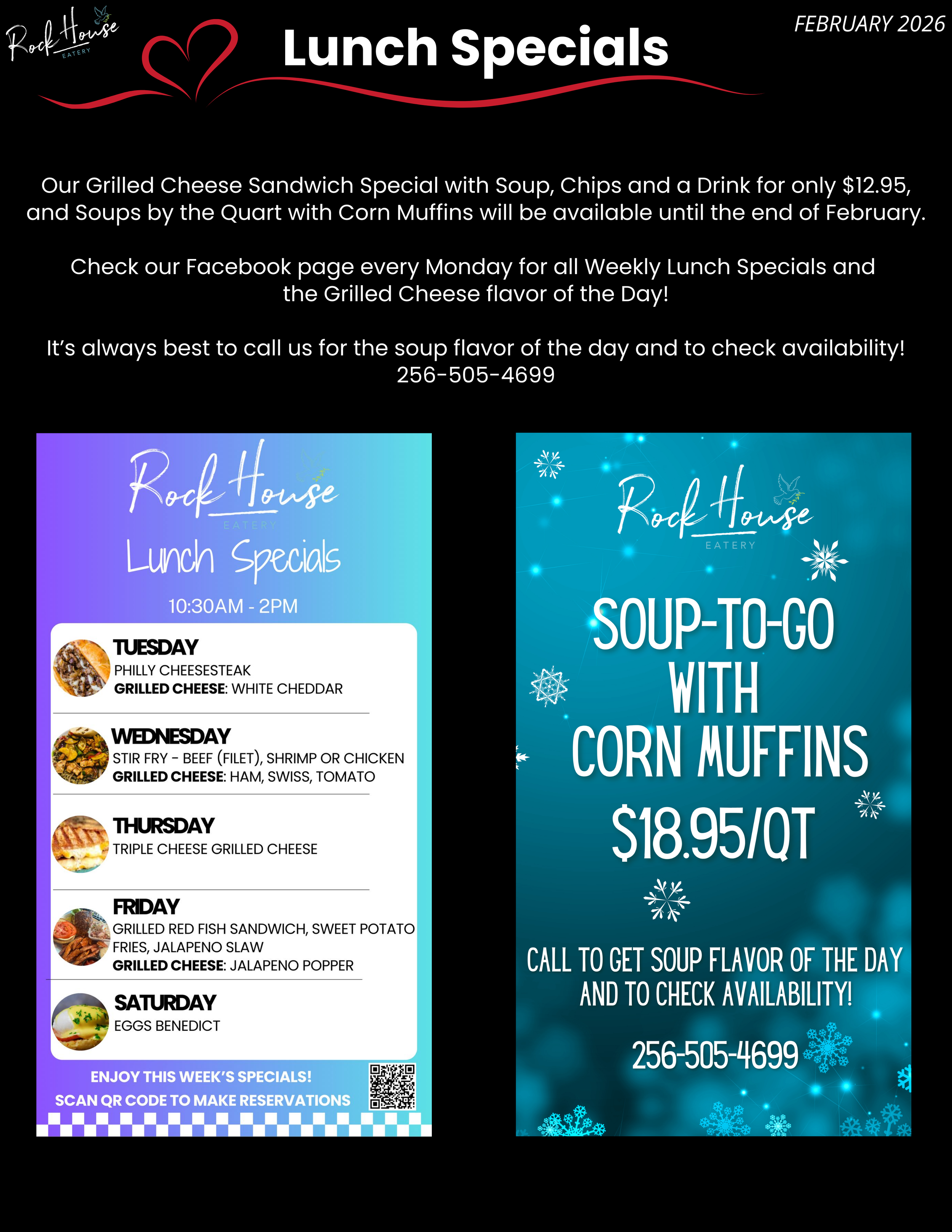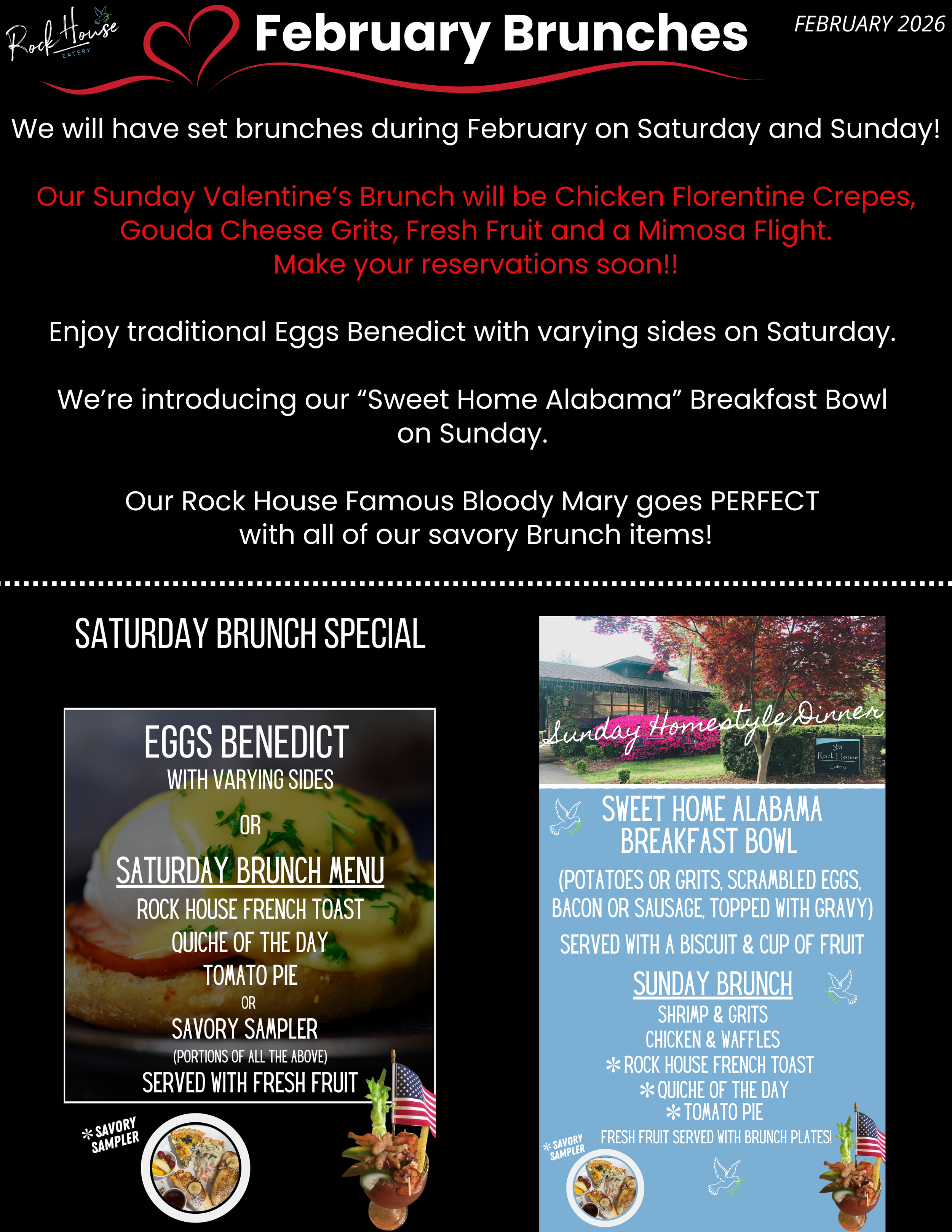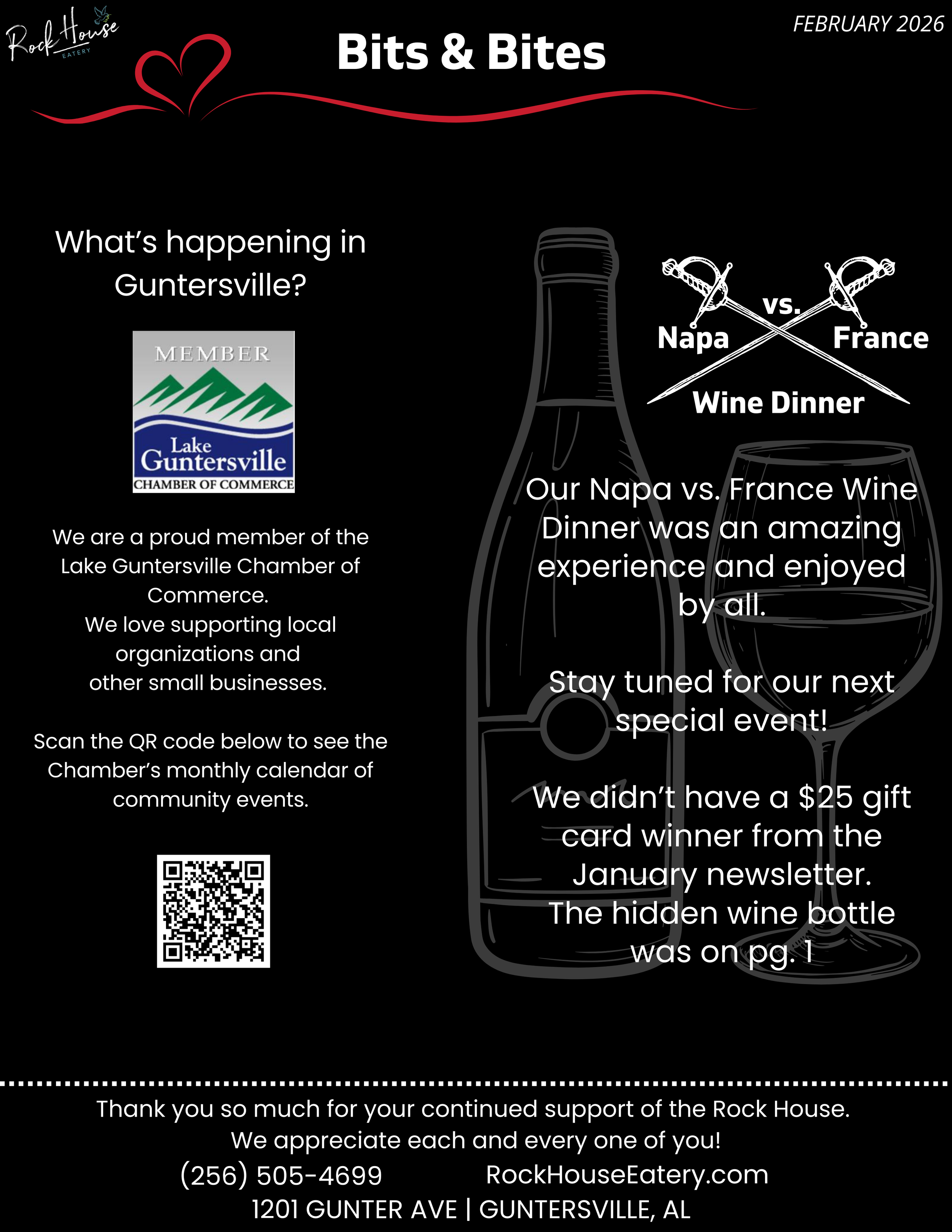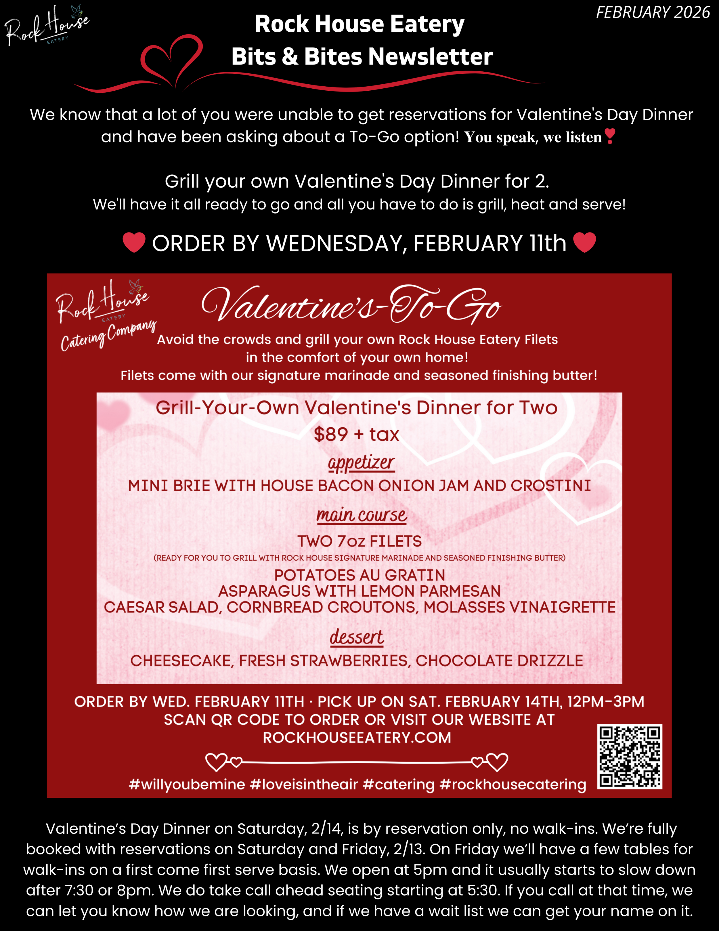 FEBRUARY 2026 ROCK HOUSE EATERY BITS & BITES NEWSLETTER Mar 7 Written By Michelle Van Natter Subscribe to Rock House Bits & Bites Newsletter Rock House Eatery is happy to announce our new Bits & Bites Monthly Newsletter. You’ll receive monthly Rockin’ deals, recipes, tips & tricks and be the first to know about special upcoming events. Before we send you any email, we need you to confirm your subscription. Sign up today to receive the latest Rock House news! Email Address Sign Up We respect your privacy. Thank you for joining Rock House Bits & Bites! We appreciate your patronage and support. PLACE VALENTINE'S-TO-GO ORDER MAKE RESERVATIONS MAKE LUNCH RESERVATIONS MAKE BRUNCH RESERVATIONS PLACE ROCK-N-GO ORDER CHAMBER CALENDAR OF EVENTS Michelle Van Natter